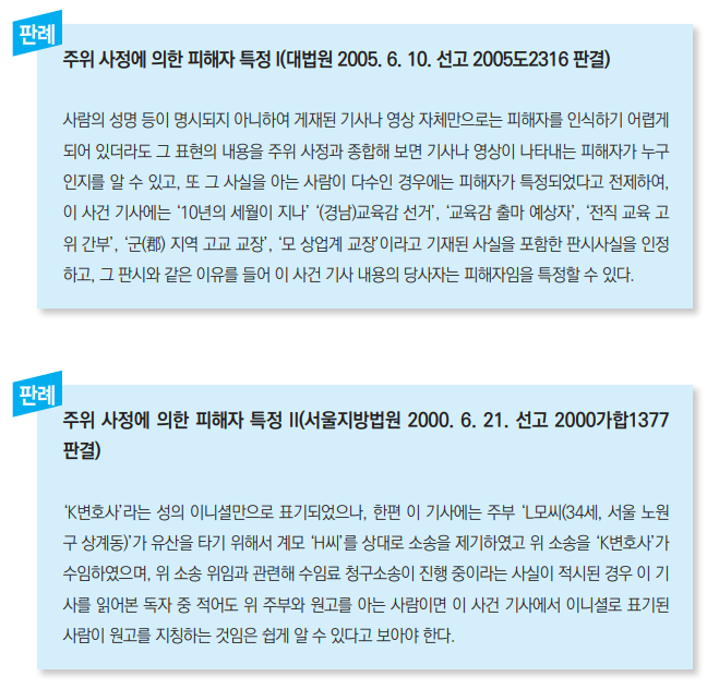 법원은 당사자가 특정되었는지 여부를 전체 일반인이 아닌 피해자 주변 사람들이 알아볼 수 있는지 여부로 매우 엄격하게 판단하고 있다. 그러므로 이름을 영문 이니셜로 하거나 성만 표기하거나 뒷모습을 촬영하는 등의 배려를 했다 하더라도 표현내용과 주위 상황(다른 언론사의 보도 내용 등)을 종합 판단하여 그 사람이 누구인가를 알 수 있으면 명예훼손에 해당된다. 또한 당사자를 불특정하기 위해 성급한 일반화를 할 경우, 예를 들어 ‘기무사 소속 현역 장성과 영관급 고급간부’라고 표현했을 경우 실제 해당자 모두에게 각각 명예훼손이 될 수 있음(집단명예훼손)을 주의해야 한다.