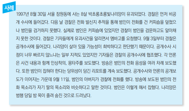 이처럼 유괴사건 해결의 성패는 언론의 협조 여부가 핵심적이다. 언론이 비공개 수사 협조를 거부할 경우 피의자를 잡기가 어려워지는 것은 물론 어린이의 생명마저 위태롭게 될 가능성이 높다. 경찰이 수사에 나섰다는 것을 피의자가 알게 되면 어린이를 살해하고 잠적해버리기 때문이다. 반면 공개수사 때에는 언론이 대대적으로 보도해서 국민의 관심과 제보를 이끌어내는 것이 피의자 검거에 커다란 역할을 하게 된다.