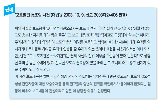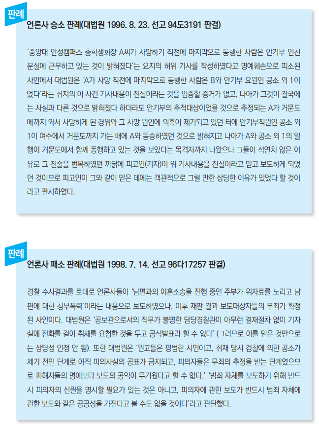 그러나 담당수사관 등에 대한 비공식적인 취재만으로 사실 확인 작업을 하지 않은 채 보도하거나 수사당국의 공식발표가 있는 경우, 공식 발표에 포함되지 않은 사실을 담당 수사관 등으로부터 비공식으로 취재하여 기사화한 때에는 취재원의 신뢰도에 차이가 있으므로 ‘진실이라고 믿을 만한 상당한 이유가 있다’고 인정받기 어렵다.
