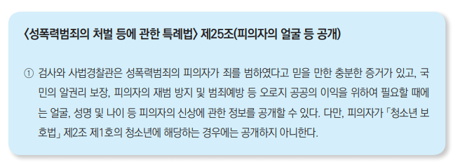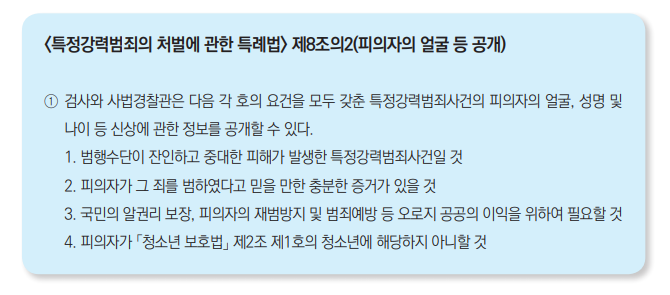 특히 피의자가 공인이 아니라면 그의 초상을 공개해서는 안 된다. 그러나 <특정강력범죄의 처벌에 관한 특례법>, <성폭력범죄의 처벌 등에 관한 특례법> 등 2개의 법률에 의해 ‘국민의 알권리 보장에 기여하고 범죄예방 등 오로지 공공의 이익을 위하여 필요할 때’ 등 몇 가지 조건을 충족할 경우 흉악범이나 성폭행범의 초상을 공개할 수 있다고 규정하고 있다. 그러나 이 경우에도 피의자가 청소년일 경우는 초상을 공개하지 않는다.