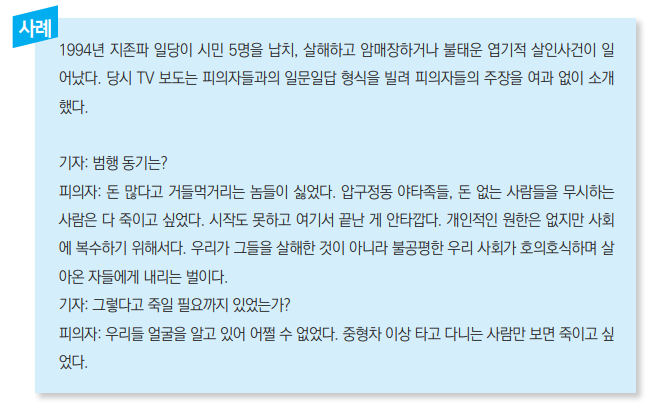 범행 내용을 자세히 보도하거나 피의자의 인터뷰를 여과 없이 그대로 보도할 경우, 범행이 자칫 미화될 우려가 있다. 또 범죄 수법을 필요 이상으로 상세하게 보도하는 것은 모방 범죄를 유발시킬 가능성이 있다.