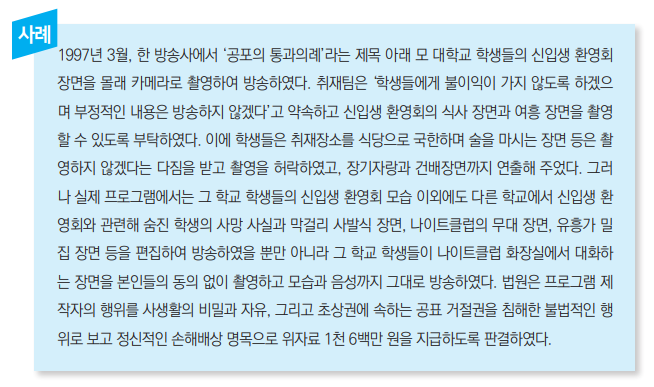이 장에서는 제작자가 취재·제작하면서 부딪치게 되는 인권 문제와 관련된 법률규정, 판례, 그리고 이를 참고로 한 제작지침 등을 제시하고자 한다. 그 내용은 꽤 복잡하고 미묘해서 제작자들이 명쾌하게 파악하기 어려운 면이 있다. 경우에 따라서는 특정 사안에 대한 법원의 심급별 판결이 다르거나 국가별로 판결이 서로 어긋나기도 한다. 방송과 인권에 관해 제작자는 취재제작과정에서 취재원과 시청자에게 겸손하고 진실하며 성실한 태도를 취해야 한다.